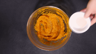 3.再倒入天然面粉,將天然面粉和南瓜泥攪拌均勻,揉制成表面光滑的面團(tuán)。面團(tuán)進(jìn)行約一個(gè)小時(shí)的發(fā)酵。